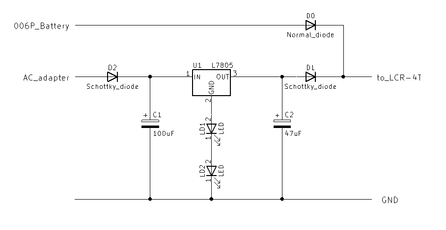 LCR-T4は内部で5V三端子レギュレータで安定化しているので、特に安定化して入力する必要はありませんが、使用する人がアバウトなので、使用するACアダプターがコロコロ変わることを想定して、逆接続防止にアダプターの入力はダイオードを経由して5V三端子レギュレータへ、但し、5Vでは電圧が低すぎるのでLED2個の下駄をはかせて、約9Vとしてします。(ACアダプターに接続される入力部のダイオードは、順方向電圧が高くなり電圧の高いACアダプターが必要になりますが、逆方向耐圧の高い普通のダイオードの方が安全性は高くなります….そんなに高い電圧のACアダプターは使わないでしょうからここではショトキーバリアを使用しています。)
