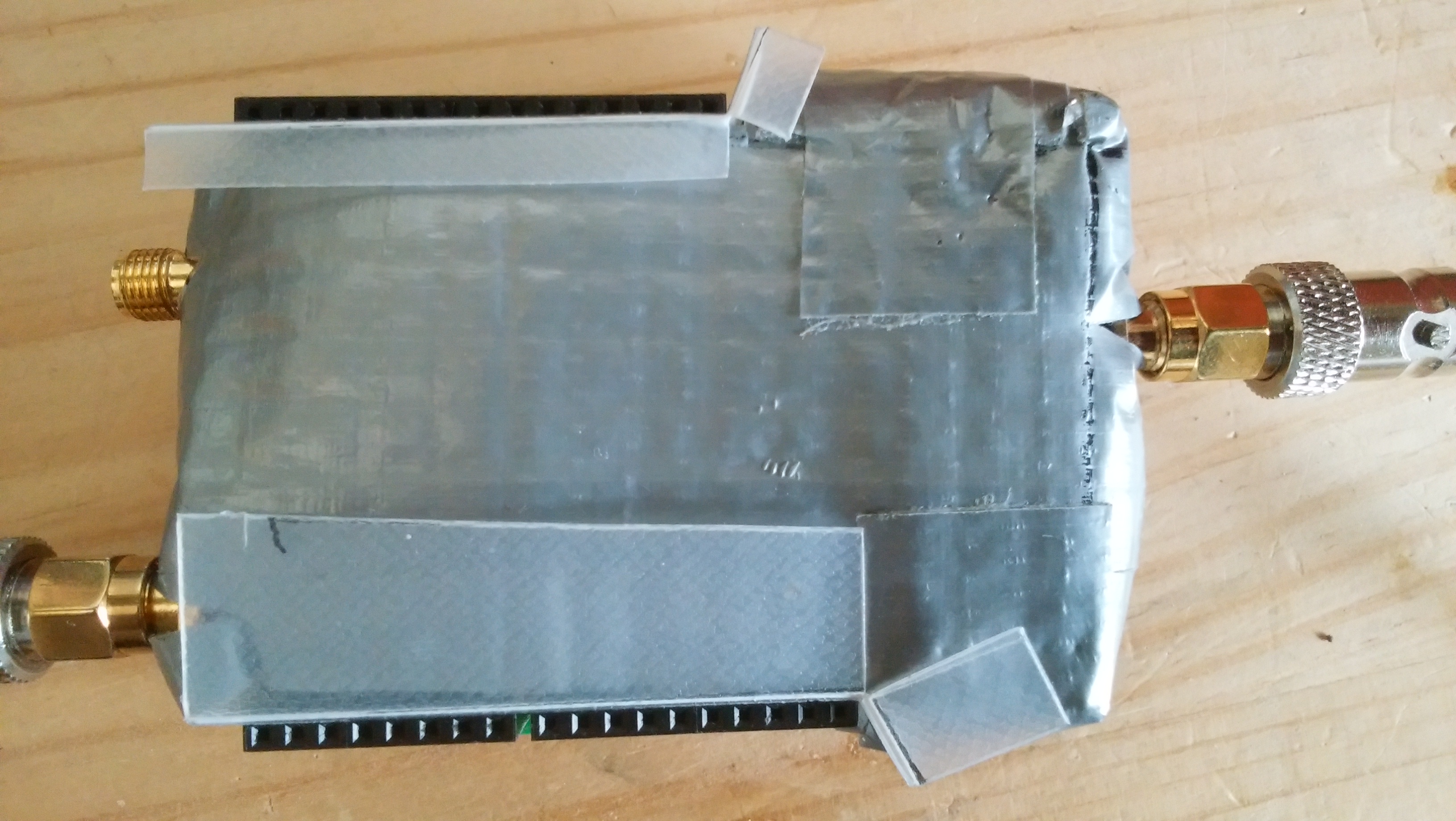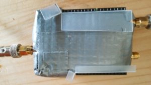 ヒーターと温度計測用センサーを水晶発振子に貼り付けただけでは、外気温の影響がかなり大きいので、オシレータが乗っているシールドを保温材でくるみます。