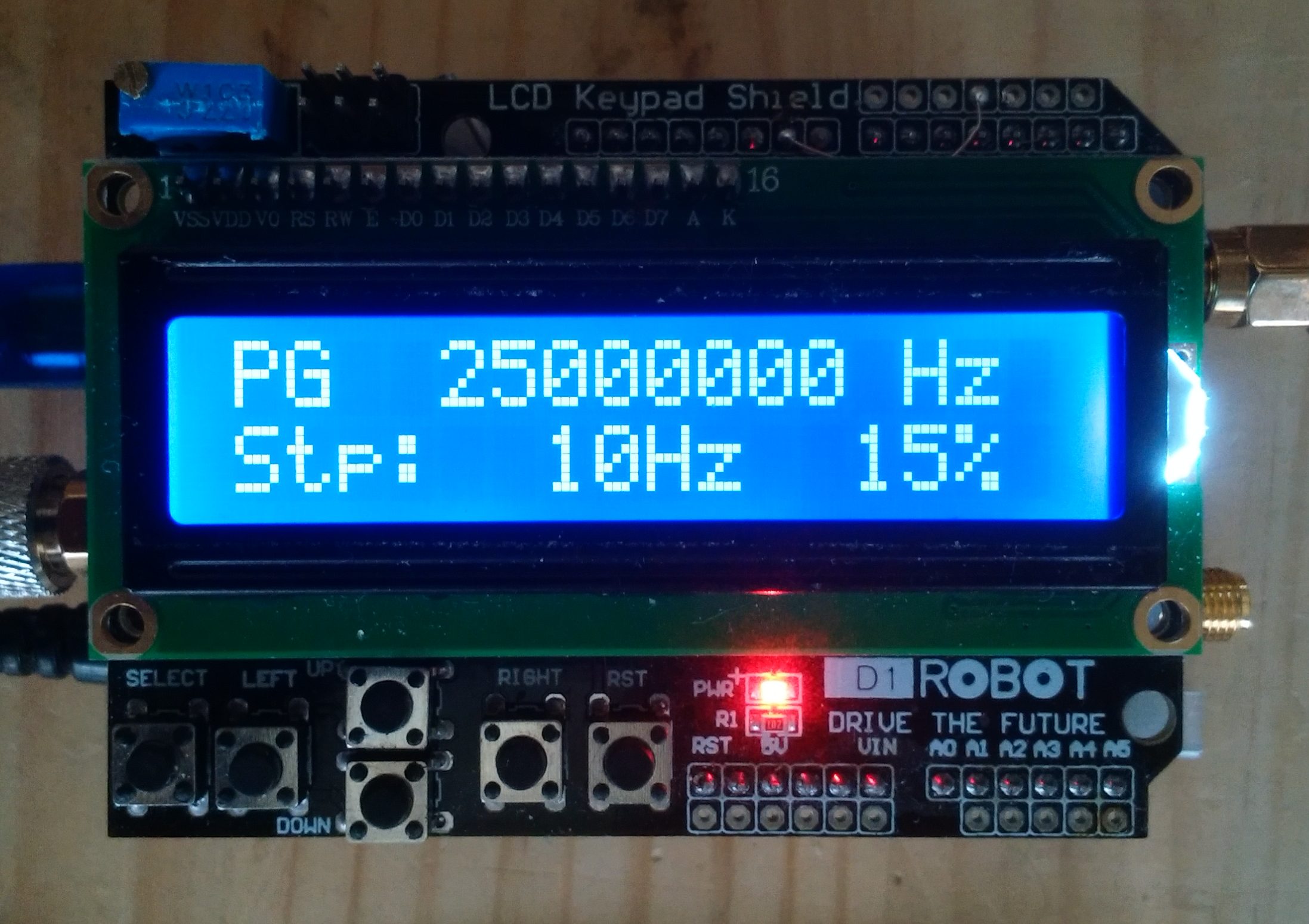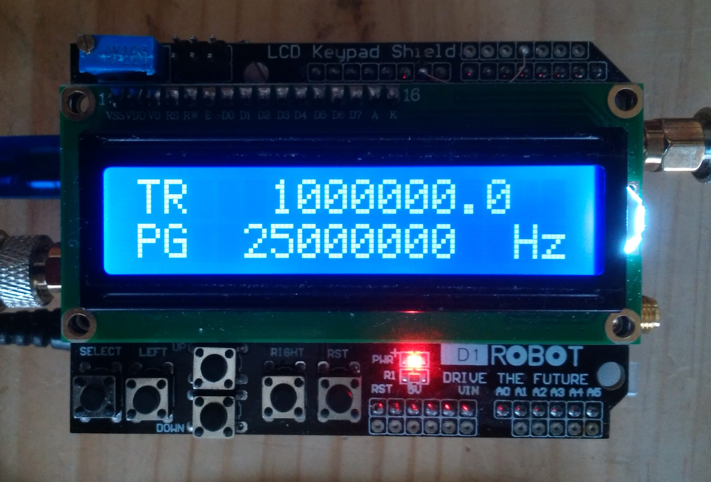 /**************************************************************************/ //v.0.1 10.10.2018 Frequency generator 1.5k...200MHz . JrDrg //v.0.1c 10.14.2018 + OSC calibration //v.0.2c 10.15.2018 PLL clock Improvement + new Algorithm //v.0.3 10.16.2018 ch2 10MHz fix //v.0.3d 10.24.2018 Tuning、 bugFix //v.0.4 10.24.2018 +AD9833 WaveGen (DDS)1-1.2MHz Practical use:-800kHz //v.0.88 11.03.2018 High precision(8bits->16bits) temperature control //v.0.89 11.03.2018 Change WG Panel+Button,+ Step operation //v.0.91 11.05.2018 add Sirial cntrol //v.0.92 11.06.2018 freq High precision : float -> long //v.0.94 11.08.2018 キャリブレーション方法の変更 //v.0.95 11.08.2018 si5351ライブラリの変更 PG:4k-225MHz /**************************************************************************/ #include <Wire.h> #include <SPI.h> #include <LiquidCrystal.h> #include <avr/io.h> #include <avr/wdt.h> /* si5351.h - Si5351 library for Arduino https://github.com/etherkit/Si5351Arduino */ #include <si5351.h> Si5351 si5351; //◆ Siral Debug 0:off 1:on 1<:manual check byte debug = 0; int SGmenu = 0;//0:Top 1:Pulse 2:Wave // select SW long Push > 5s => Top menu const int loopwait = 100; int chrcnt = 0; //Sirial command I/F Chra count uint8_t input[33]; int cmdphase = 0; //Sirial command phase long Num; int64_t NumL; // heater setup #define ht_pin 9 // pin 3 -> 9(16bits PB1) // Temp ctrl start time int initwait = 3000; // about 5minits [3000*loopwait] // Temp Transient characteristics const int invtimerlimit_base = 5000; // about 5s Temp ctrl interval int invtimerlimit = invtimerlimit_base; int invtimer = 0; int temploop = 0; int anlg1; int anlg2; //WaveGen OSC Temp float temp; float temp2; float temp2_old = 0; float dtemp; //◆ Target oven temp const int terget_temp_base = 52; //simple oven temp int terget_temp = terget_temp_base; int heater = 160; //heater init set 150-205 <0-1023> /* Key setup */ int lcd_key = 0; int adc_key_in = 0; int adc_key_in2 = 0; #define btnRIGHT 0 #define btnUP 1 #define btnDOWN 2 #define btnLEFT 3 #define btnSELECT 4 #define btnNONE 5 #define waveSELECT 6 const int lcdLED = 10; LiquidCrystal lcd(8, 3, 4, 5, 6, 7);//9->3 /*AD9833 WaveGen (DDS) Setup*/ const int SINE = 0x2000; // Define AD9833's waveform register value. const int SQUARE = 0x2028; // When we update the frequency, we need to const int TRIANGLE = 0x2002; // define the waveform when we end writing. int wave = 0; int waveType = SINE; //◆ Set wave generator initial frequency. unsigned long freq10 = 10000000; //freq * 10 const long freqTRmax = 1200000; // max 1.2MHz(Practical 1MHz) const long freqSQmax = 1200000; // max 1.2MHz(Practical 500kHz) const long freqSImax = 6000000; // max 5MHz(Practical 5MHz) unsigned long freqMAX = freqSImax; //◆ Wave generator OSC clock const long refFreq_base = 250003334; // On-board crystal reference frequency 25000318.4*10 unsigned long refFreq10 = refFreq_base; const int FSYNC = 2; // Standard SPI pins for the AD9833 waveform generator. 10=>2 const int CLK = 13; // CLK and DATA pins are shared with the TFT display. const int DATA = 11; const int CS = A3; //MCP41010 potentiometer 9=>A3(17) // digital pot values for differant wave forms to maintain constant output level(1-255) const int TRPOTmax = 220; const int SQPOTmax = 29; const int SIPOTmax = 220; int TRPOT = 126; int SQPOT = 15; int SIPOT = 126; int exPOTmax = SIPOTmax; int exPOT = SIPOT; // potmode for determining digipot setting byte potVal = exPOT; int adc_key_wait = 40; int read_LCD_buttons() { // take measures to chattering adc_key_in = analogRead(0); delay(adc_key_wait); adc_key_in2 = analogRead(0); if (abs(adc_key_in - adc_key_in2) > 2) return btnNONE; // For V1.1 us this threshold if (adc_key_in > 1000) return btnNONE; // We make this the 1st option for speed reasons since it will be the most likely result // For V1.1 us this threshold if (adc_key_in < 50) return btnRIGHT; if (adc_key_in < 250) return btnUP; if (adc_key_in < 350) return btnDOWN; if (adc_key_in < 550) return btnLEFT; if (adc_key_in < 850) return btnSELECT; return btnNONE; } void wait_btnNONE() { lcd_key = read_LCD_buttons(); // read the buttons while (lcd_key != btnNONE) { lcd_key = read_LCD_buttons(); // read the buttons } } //◆ Pulse Gen OSC Normal: oscf=25000000 const long oscf_base = 25000000 ; //base OSC frequency const long osc_devi_stnd = 56990 ; // (偏差/10MHz) ppm long pcal_devi = osc_devi_stnd ; //Ref Volt float Vref; //◆ Pulse Generator Initial Output Clock Freq uint64_t outF = 25000000 ;// initial frequency in Hz const long outF2 = 10000000; //ch2: Fix frequency uint32_t stpx; //freq freq step size uint8_t changed_f = 1; char msg10[10]; char s8[8]; /**************************************/ /* Calc Pram & Displays the frequency */ /**************************************/ void count_frequency() { /**************************************/ /* Displays the PG frequency */ /**************************************/ lcd.clear(); lcd.setCursor(0, 0); char msg[12]; char s[9]; char msg4[5]; char s4[2]; sprintf(msg, "PG %s", dtostrf((outF / 10), 8, 0, s)); sprintf(msg4, "%s Hz", dtostrf((outF % 10), 1, 0, s4)); lcd.print(msg); lcd.print(msg4); display_stpx(); } /**************************************/ /* Display the frequency change step */ /**************************************/ void display_stpx() { lcd.setCursor(0, 1); lcd.print("Stp:"); switch (stpx) { case 10: lcd.print(" 10"); break; case 100: lcd.print(" 100"); break; case 1000: lcd.print(" 1k"); break; case 10000: lcd.print(" 10k"); break; case 100000: lcd.print("100k"); break; case 1000000: lcd.print(" 1M"); break; case 10000000: lcd.print(" 10M"); break; } lcd.print("Hz "); } void setup_PGfreq0() { //◆ display setup param if (changed_f > 0) { count_frequency(); uint64_t outF_100 = outF; outF_100 = outF_100 * 100; si5351.output_enable(SI5351_CLK0, 0); delay(10); si5351.set_correction(pcal_devi, SI5351_PLL_INPUT_XO); si5351.set_ms_source(SI5351_CLK0, SI5351_PLLA); si5351.set_freq(outF_1