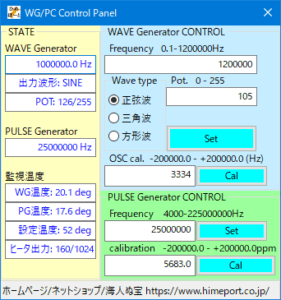 オーディオ帯域のポテンショメータが使用されていてるので、実用周波数は1MHz+α程度ですが、簡単に方形波、三角波、正弦波が得られ、max5Vp-p(実力はせいぜい3V程度)ですが出力レベルの調整もできます。